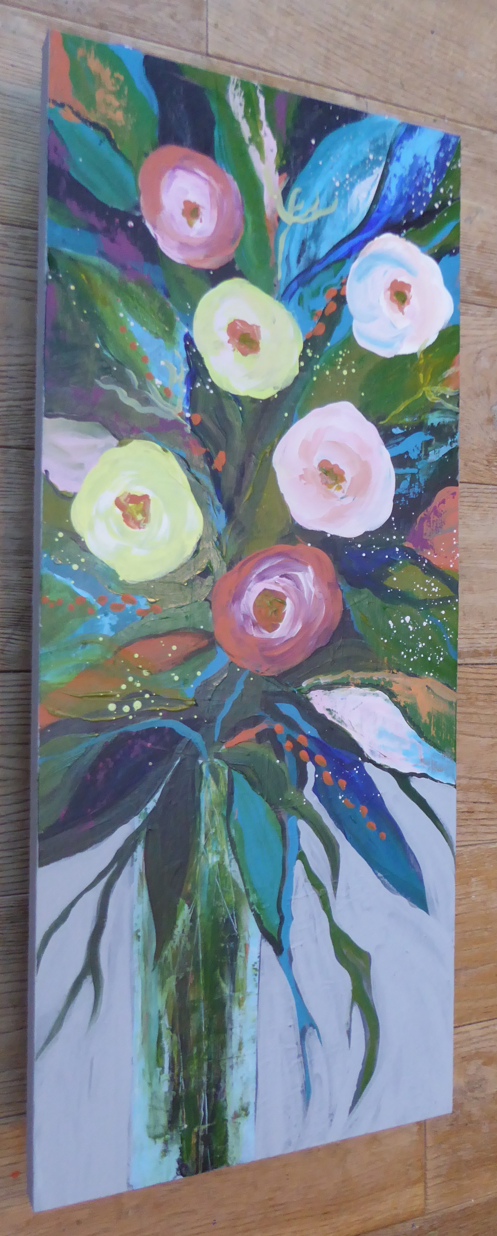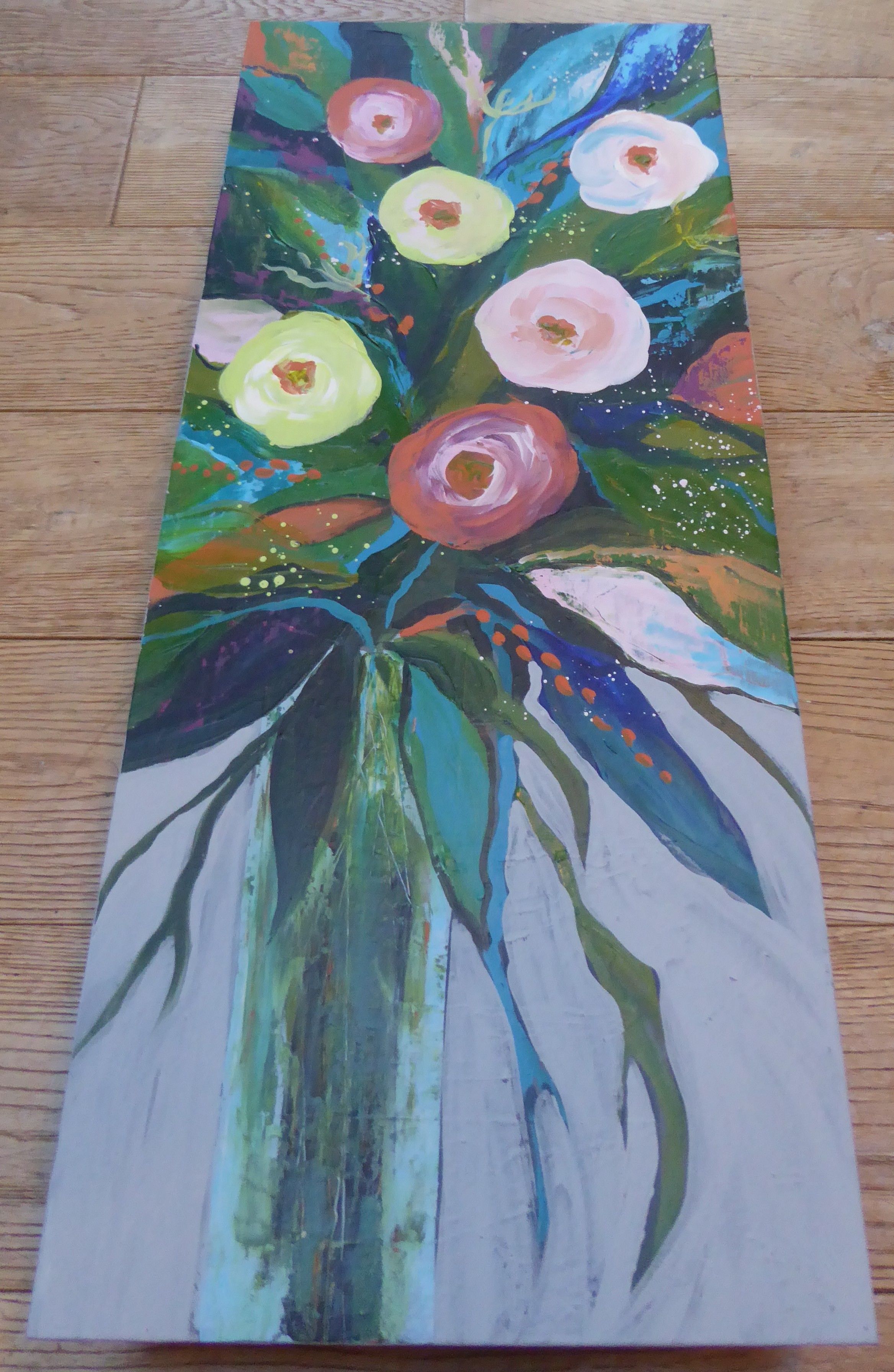 Acrylic on canvas, varnished, sides painted grey, strung on the back, signed on the back, 25cm x 60cm