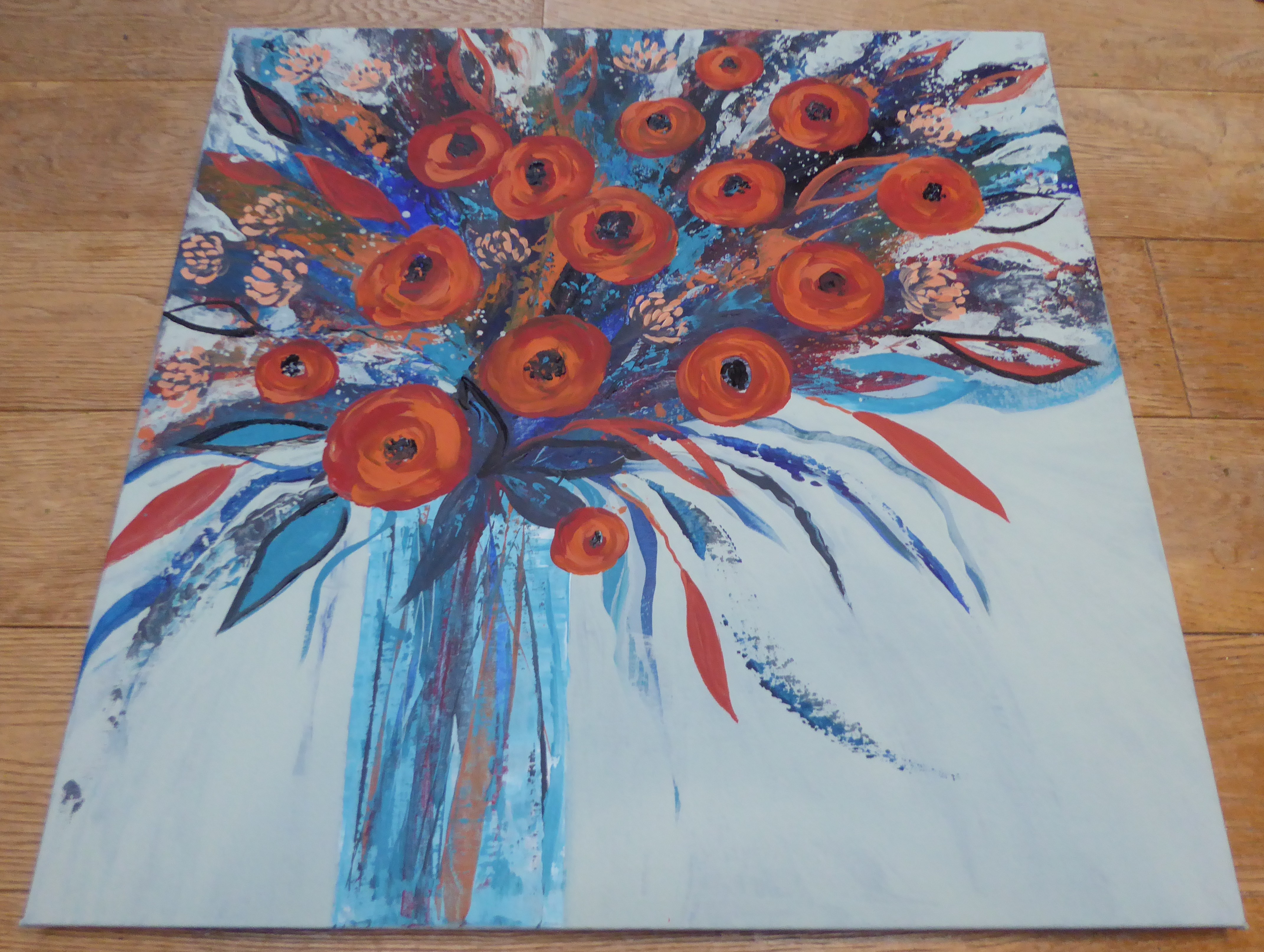 Acrylic on canvas, varnished, sides painted duck egg blue, strung on the back, signed on the back, 57cm x 57cm