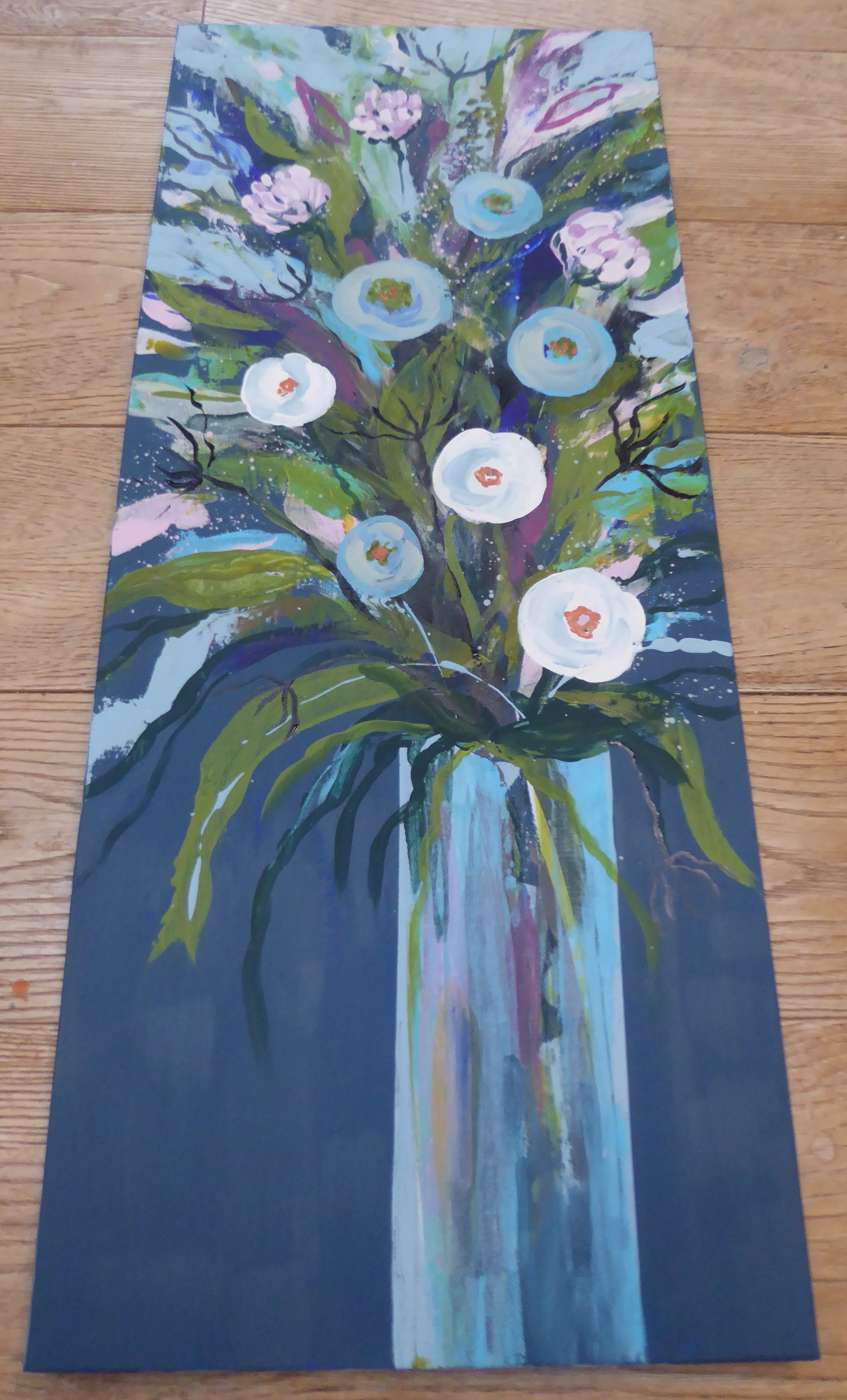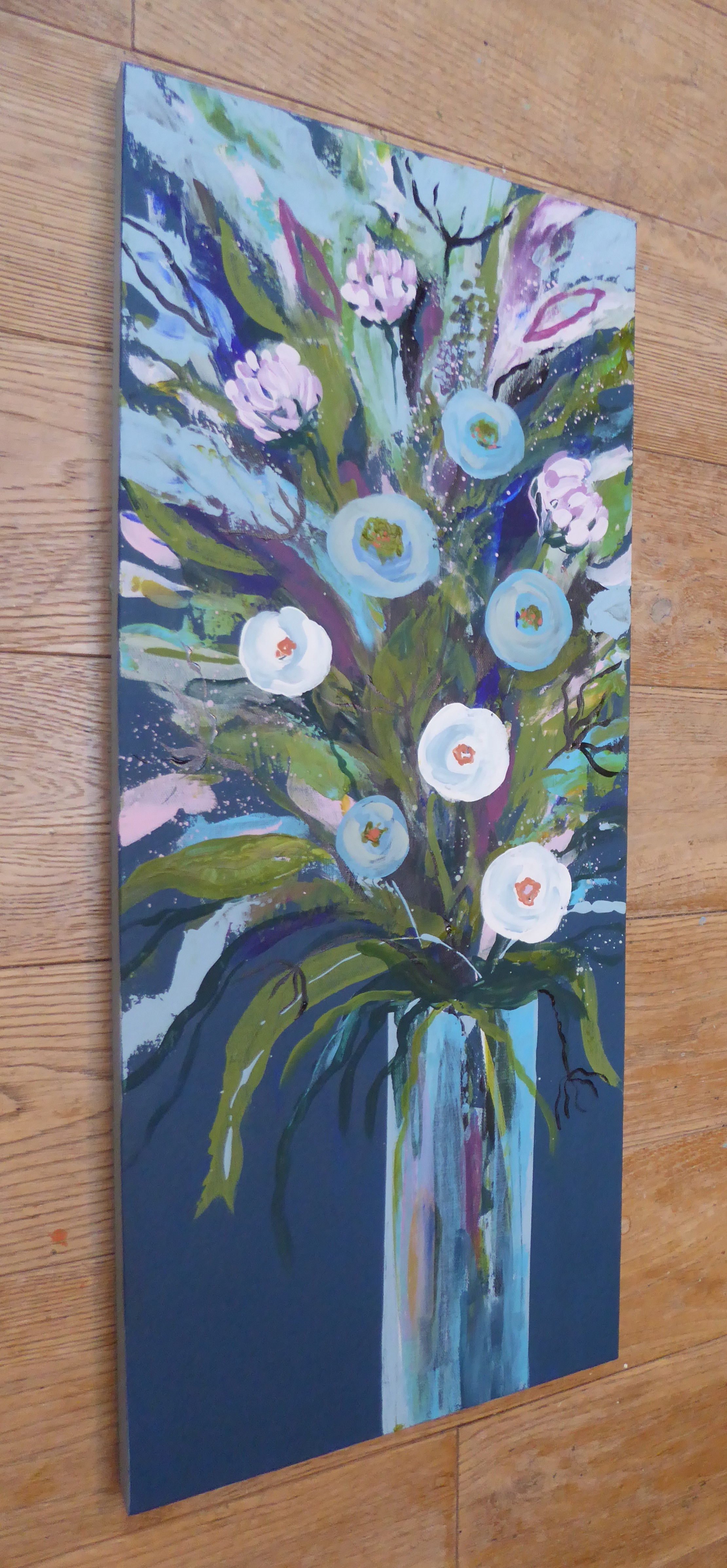 Acrylic on canvas, varnished, sides painted sage, strung on the back, ready to hang, 25cm x 60cm